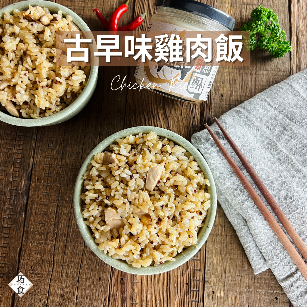 台灣冠軍越光米、國產檢驗合格雞肉、紅藜麥、自煉台灣可溯源檢驗合格豬油、紅蔥頭、古法釀造醬油(黑豆、水、鹽、糖、甘草)、鹽巴