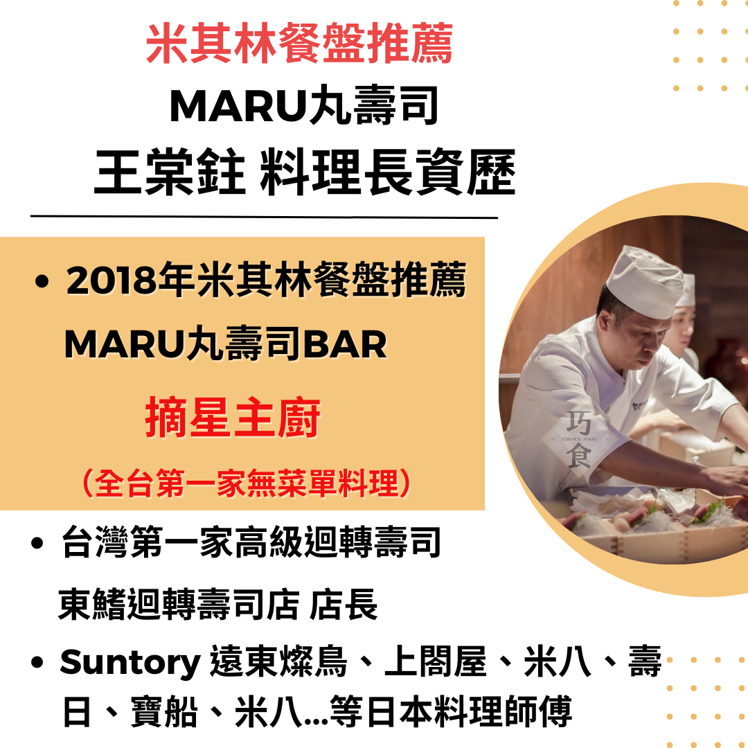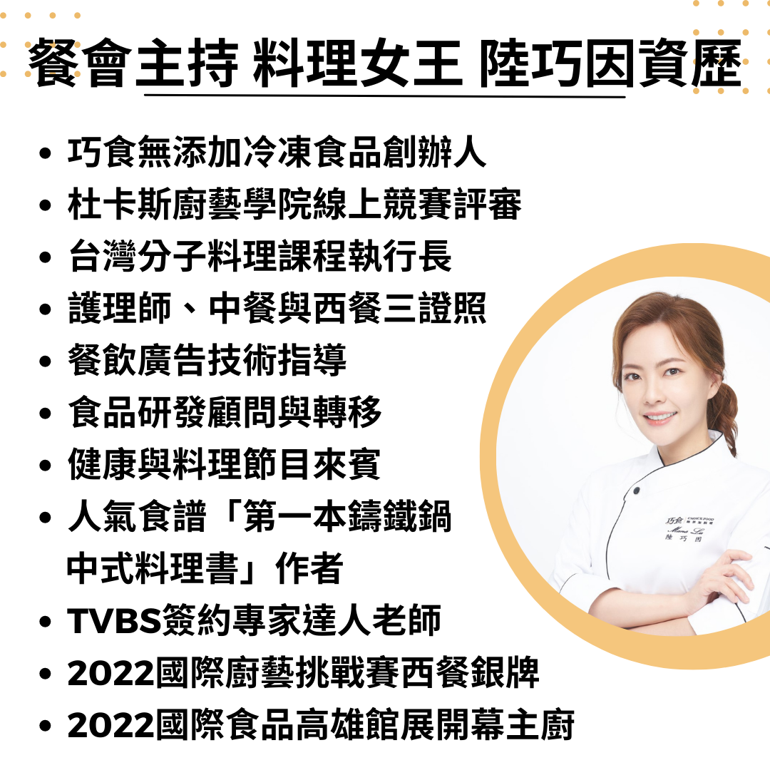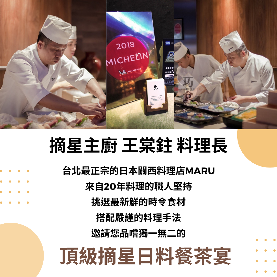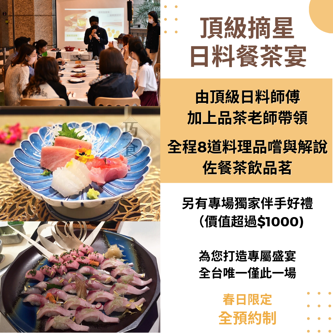 巧食特請由台灣摘星「日本料理MARU料理長王棠鉒」,親臨巧食並為此次餐會獨家設計食令日料,您不僅可品嚐20年的職人精神的好手藝,更能全程與師傅互動,了解食材背後更多知識與技巧;加上貴婦百貨等各大單位指定品茶講師「十本初壹總經理鄭絜方」,帶領您輕鬆進入茶飲的世界,還有巧食創辦人「料理女王陸巧因」親自主持餐會活動。專場贈送獨家好禮!餐會後可加入獨家群組,獲得更多餐會與課程最新情報。